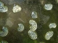 ですので、淡水の水槽で生まれた石巻貝の幼生は、生き延びられず死んでしまうそうです。 しかも驚いたことに、あのゴマ粒大の卵は卵塊(卵のう)で、あの中に本当の卵が 100個 も入っているらしい。